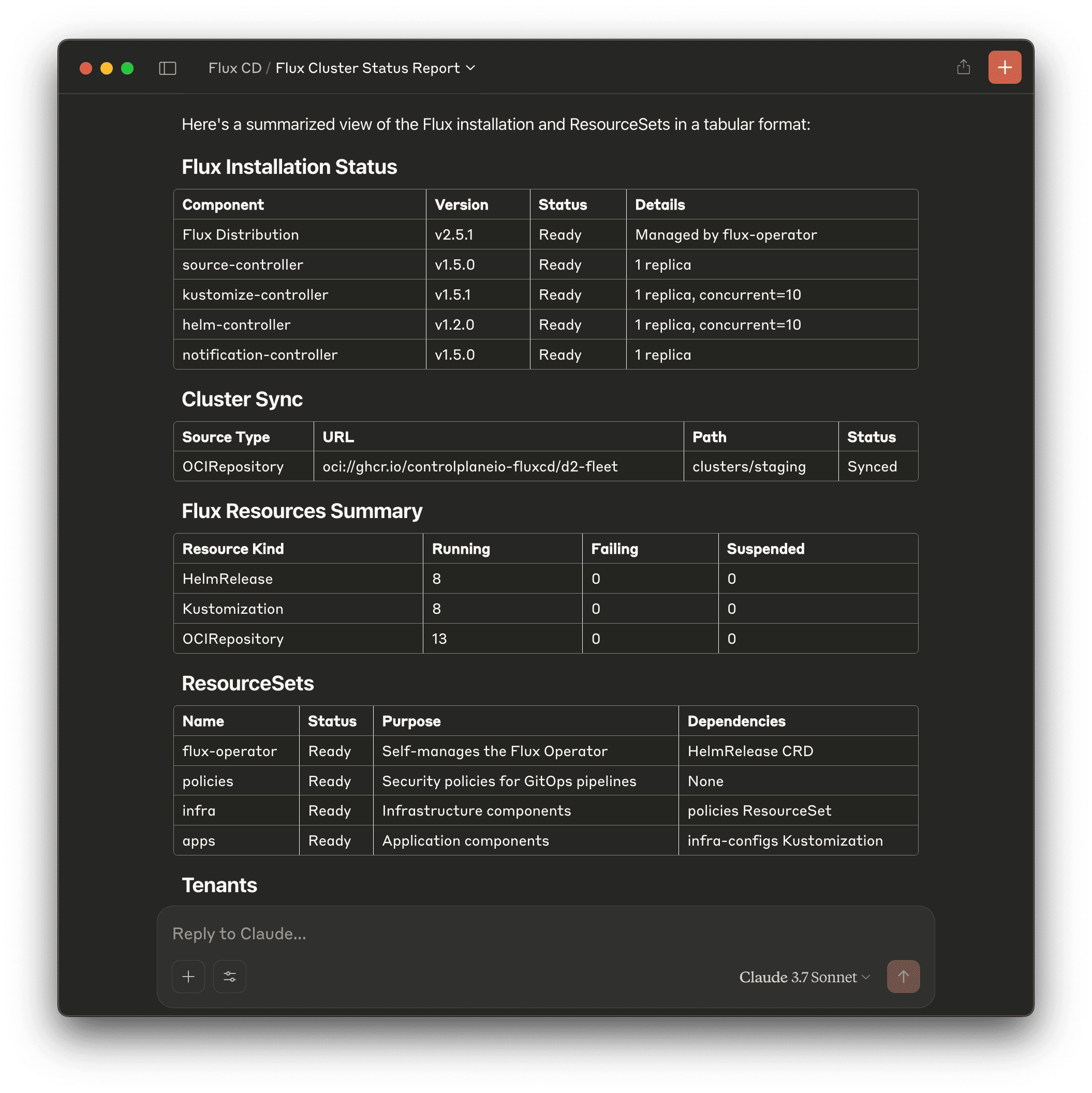 Instead of running multiple kubectl and flux commands to check the status of your GitOps pipeline, you can simply ask:
