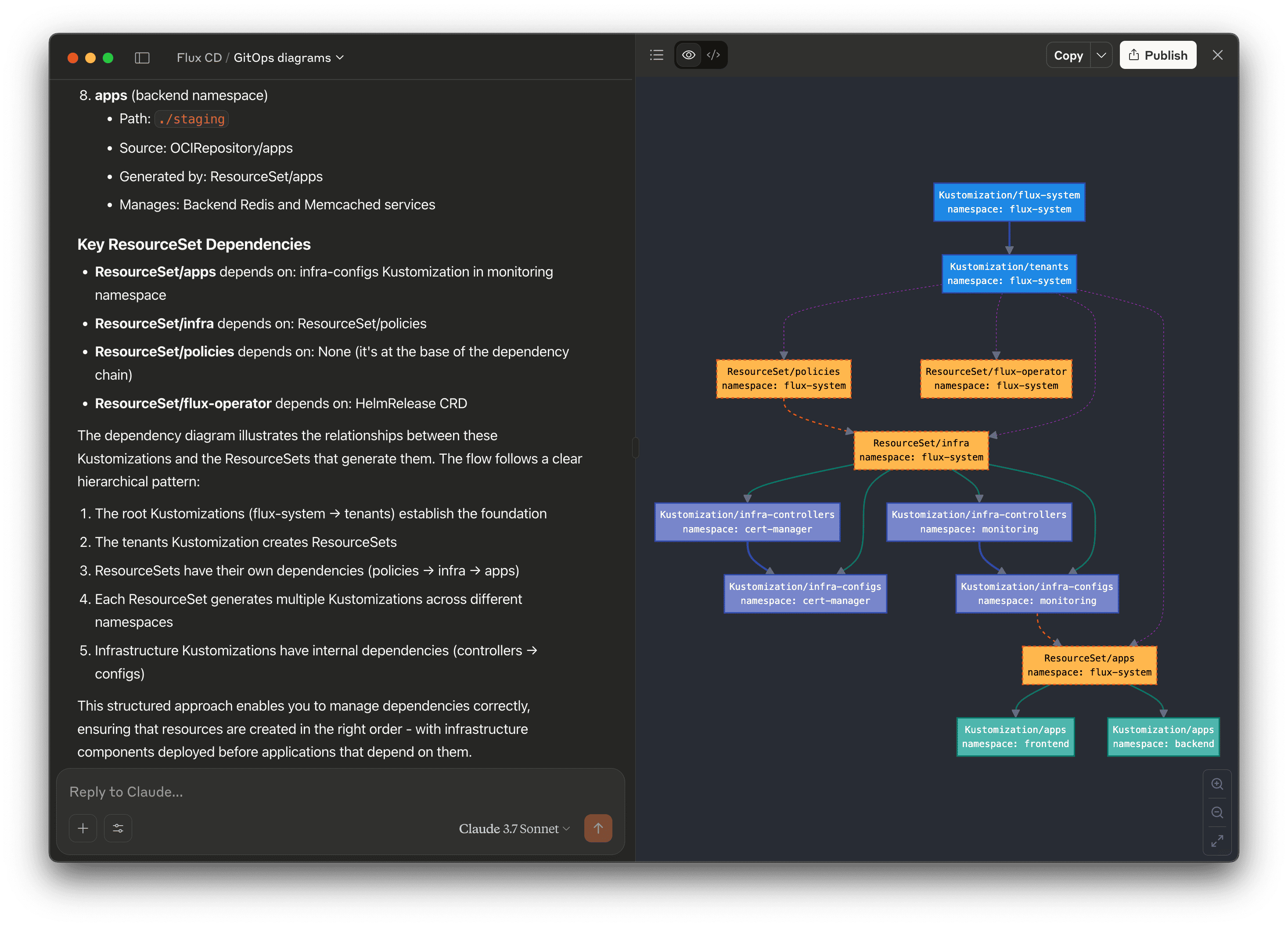The AI will generate a visual representation of your GitOps pipeline, showing the dependency relationships between Flux Kustomizations and helping you understand the deployment order and potential bottlenecks.